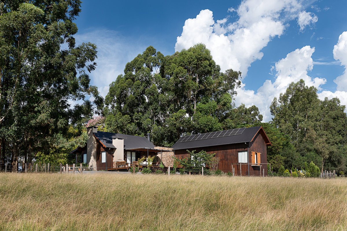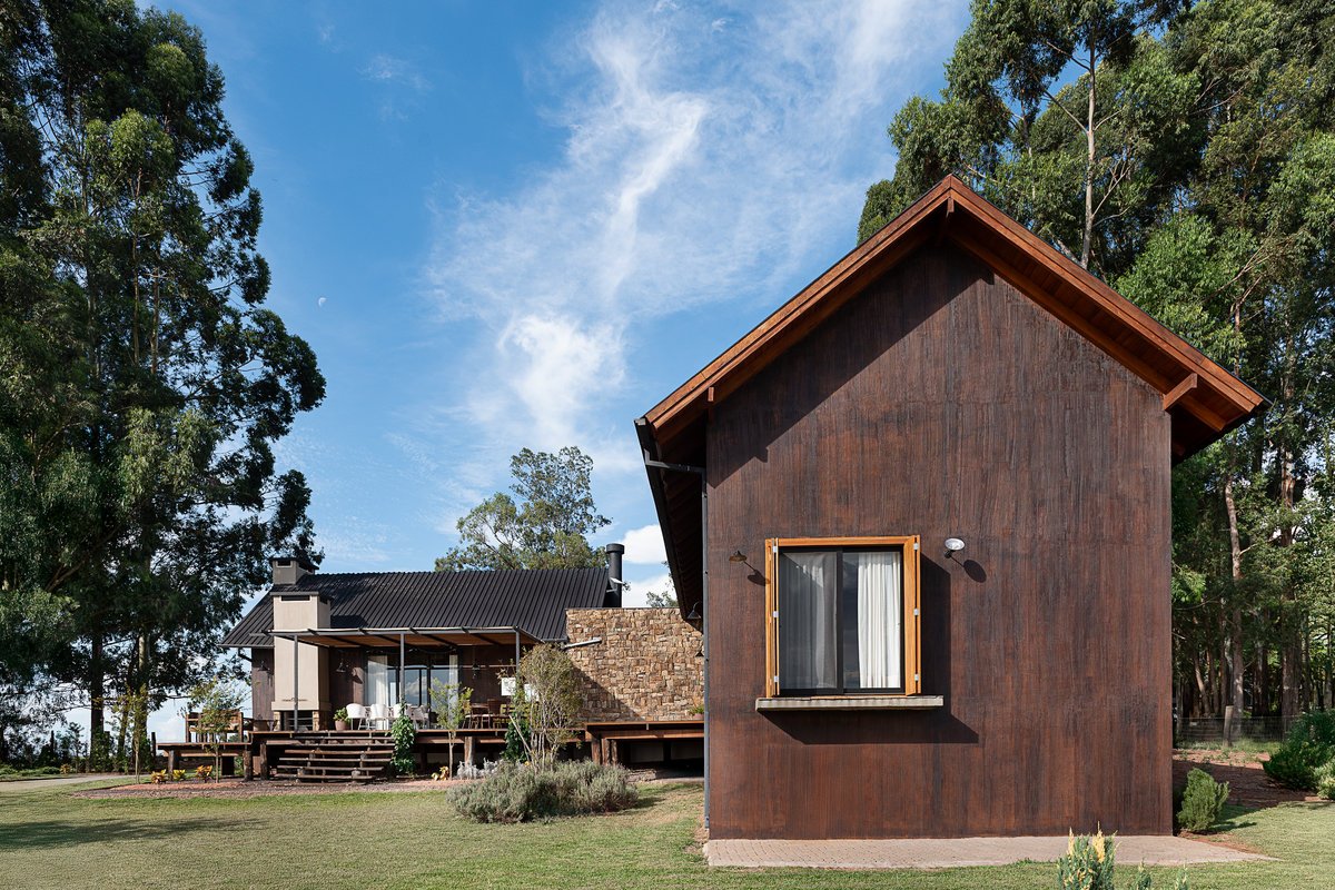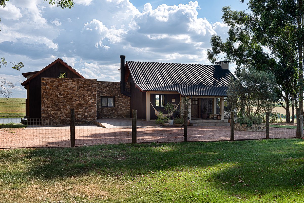 Assinada pela arquiteta Valéria Cerutti Dumoncel, à frente do Atelier Arquitetura, esta casa localizada no interior do Rio Grande do Sul foi projetada para refletir o estilo de vida de sua moradora — amiga e cliente de longa data — e acolher encontros familiares em meio à paisagem natural.