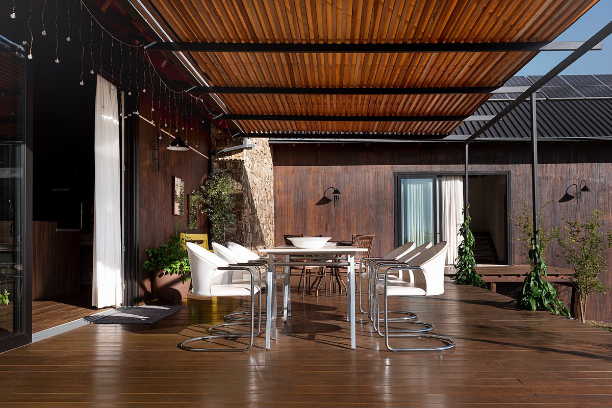 No centro da experiência arquitetônica está o grande deck com lareira, posicionado estrategicamente para valorizar o pôr do sol — um desejo expresso pela cliente desde o início. O espaço externo, envolto por vegetação nativa e elementos em terracota, atua como extensão da casa, promovendo acolhimento e bem-estar.