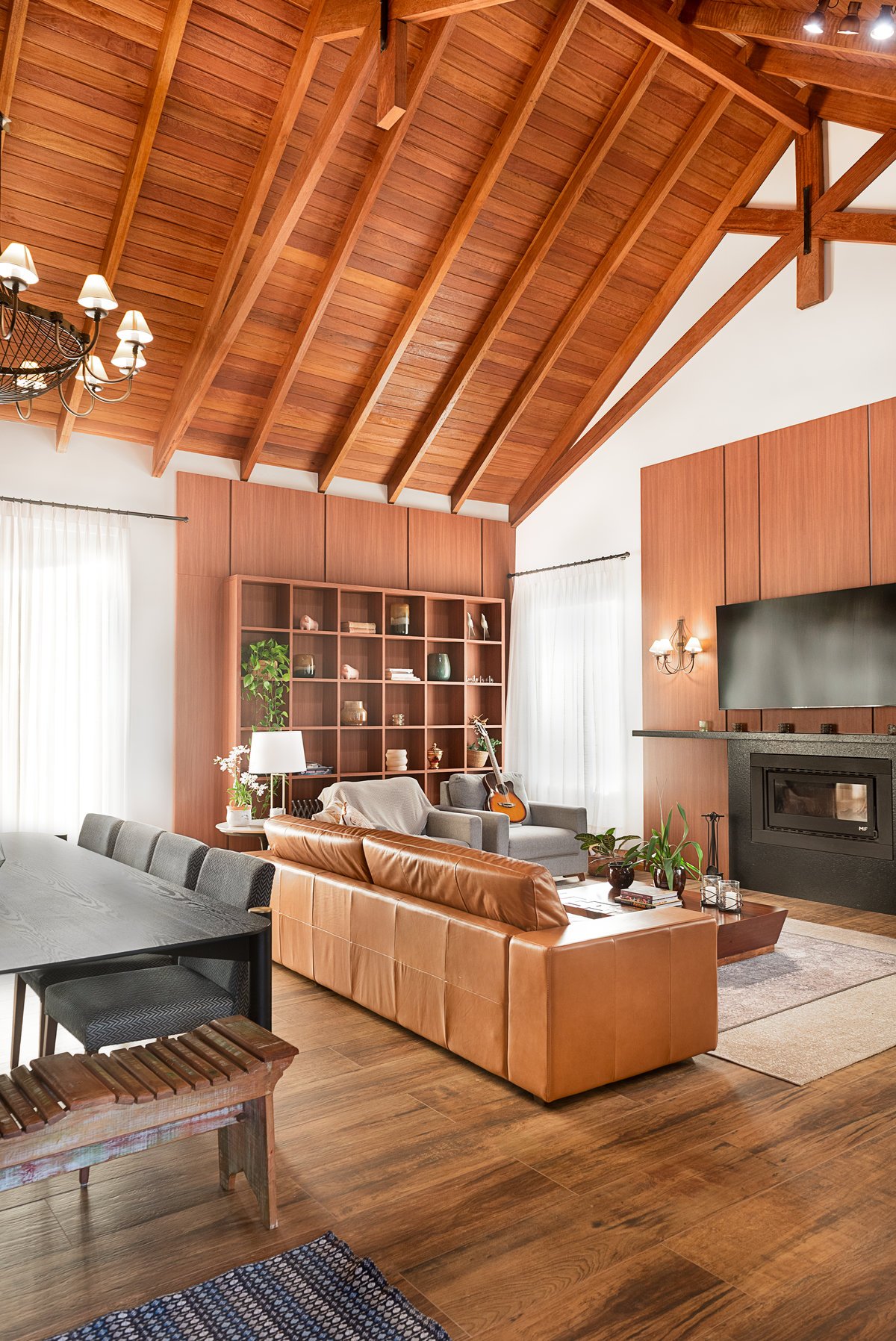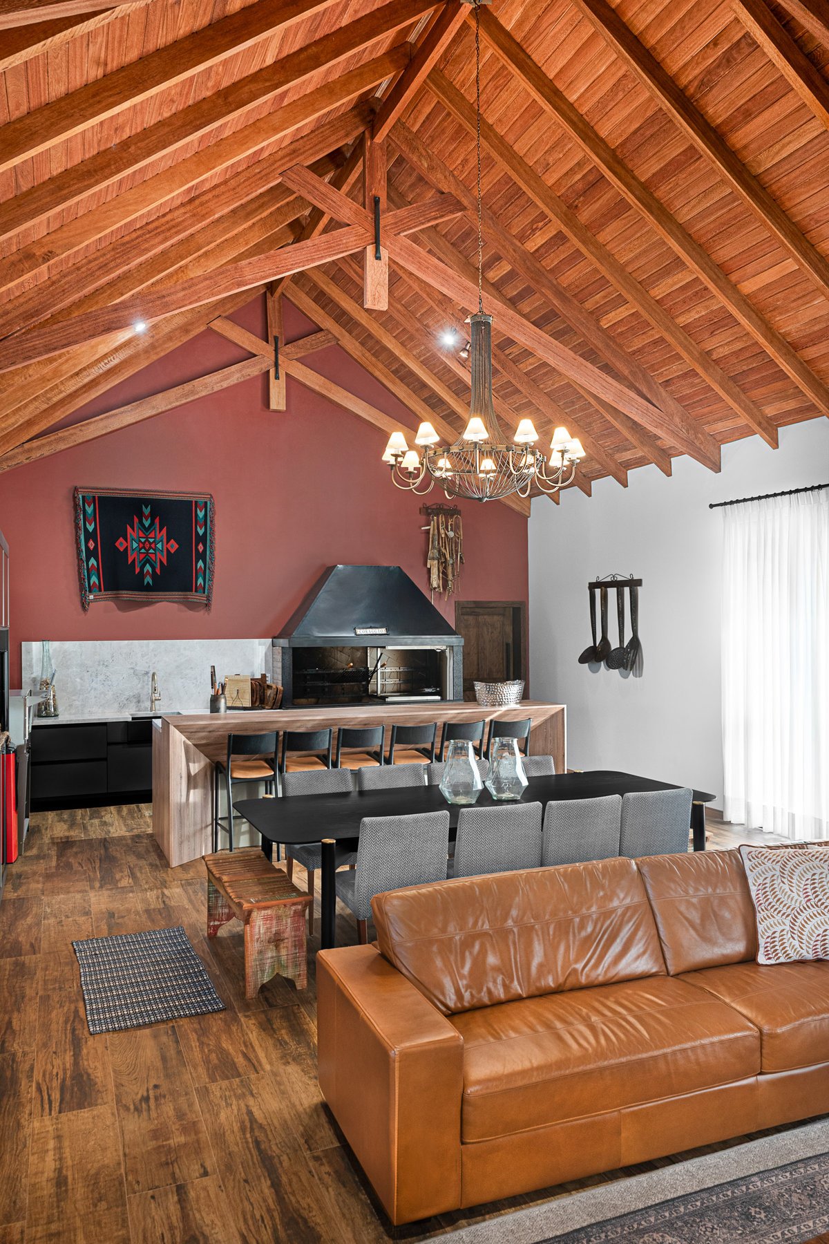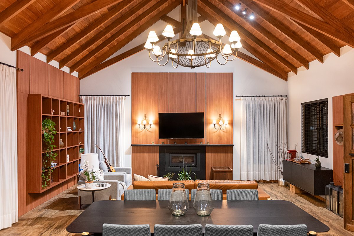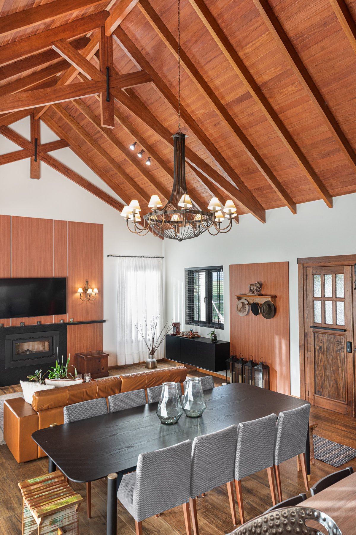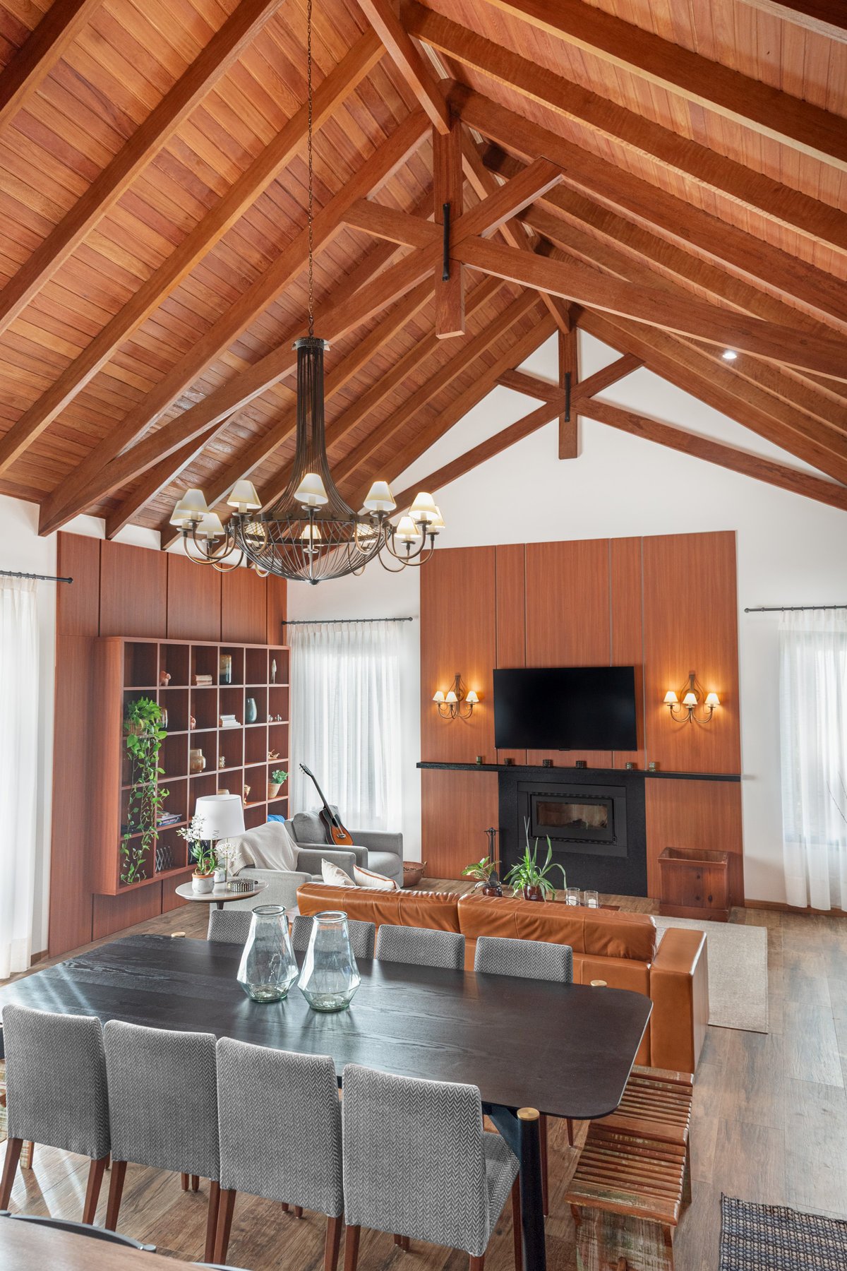 Internamente, o pé-direito elevado com estrutura aparente em madeira aquece visualmente o ambiente, enquanto a marcenaria sob medida e o mobiliário confortável completam a atmosfera de lar. A iluminação natural é valorizada por aberturas bem posicionadas e cortinas leves que emolduram a paisagem.