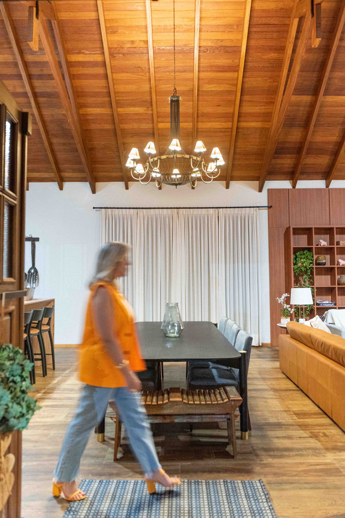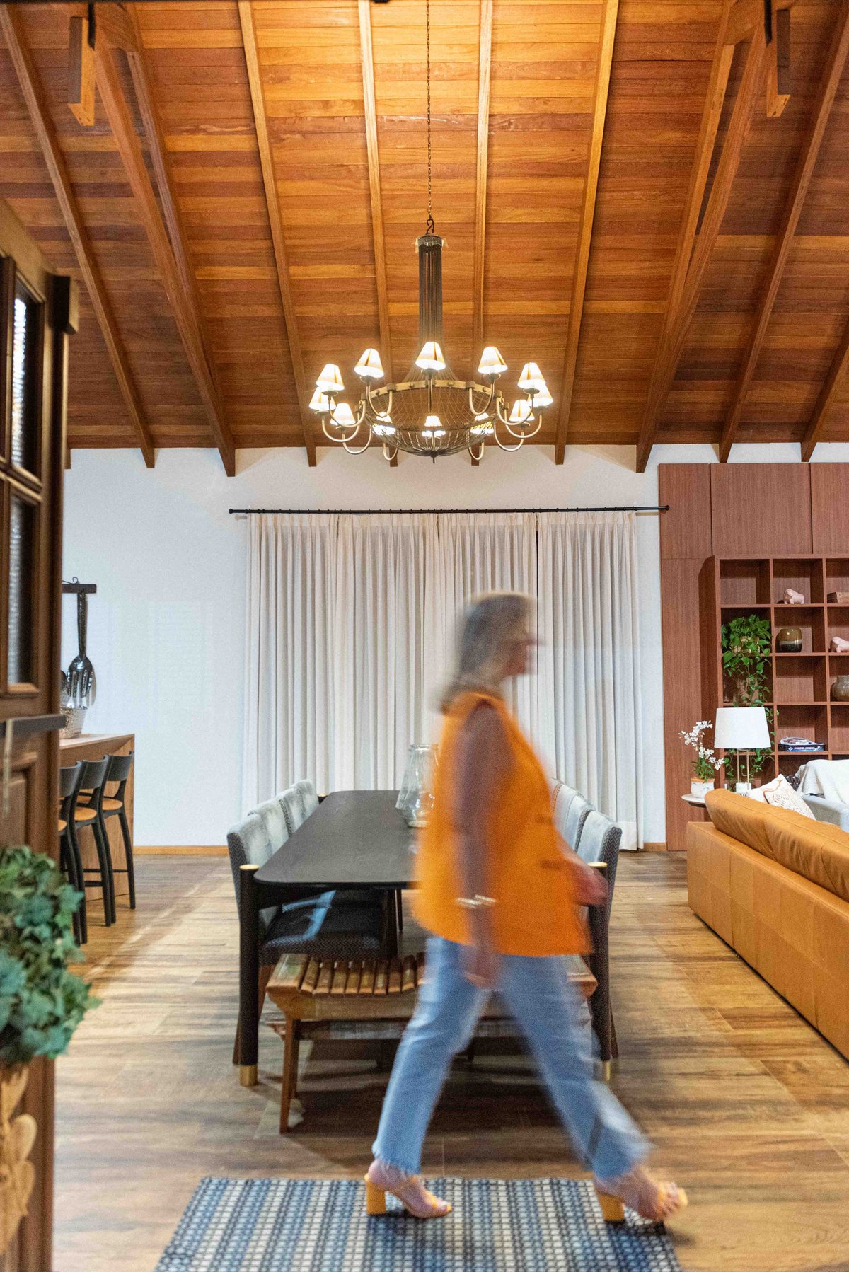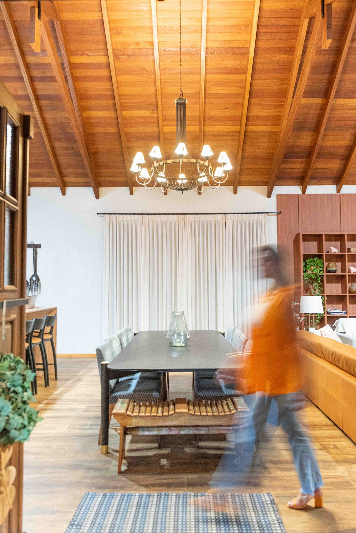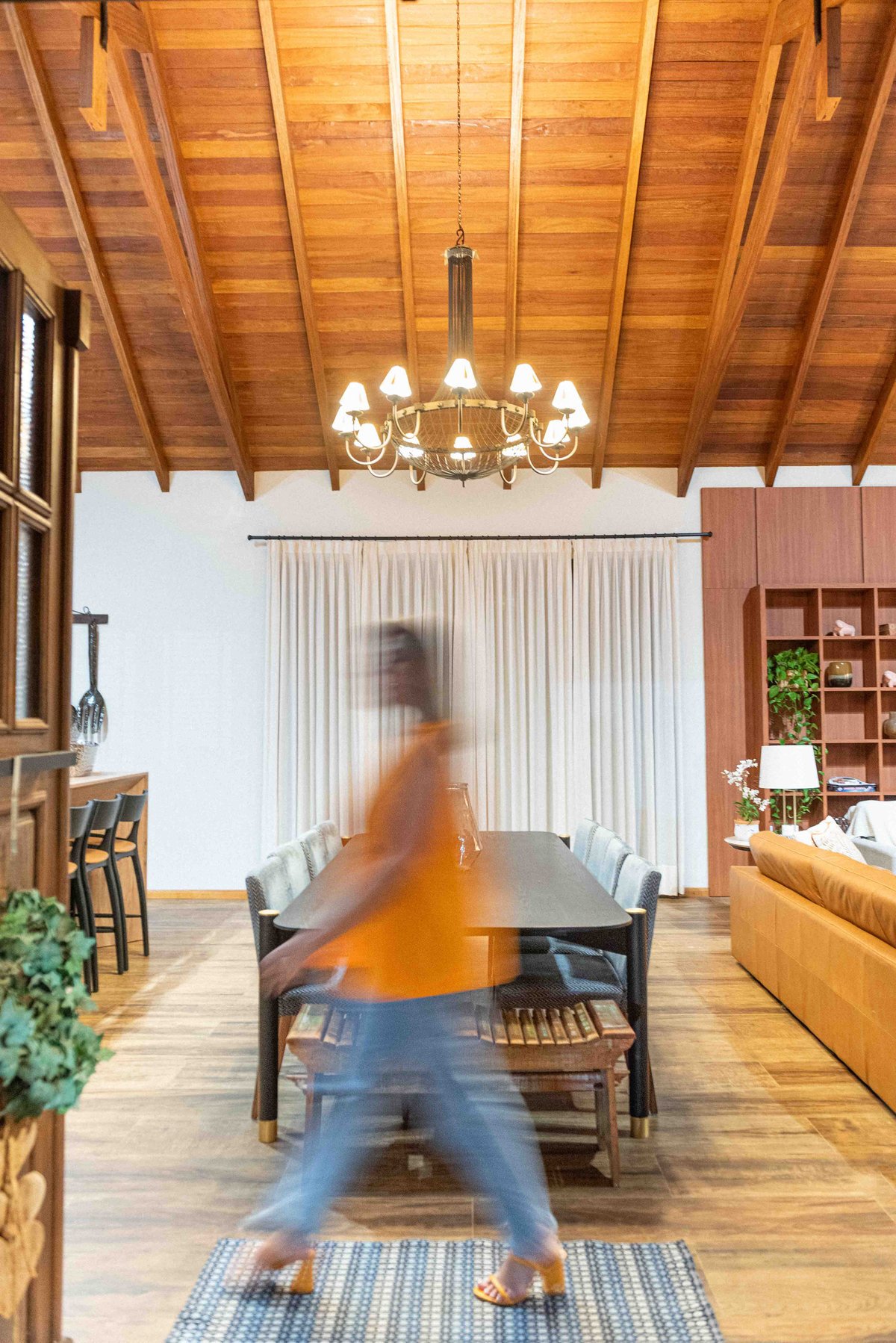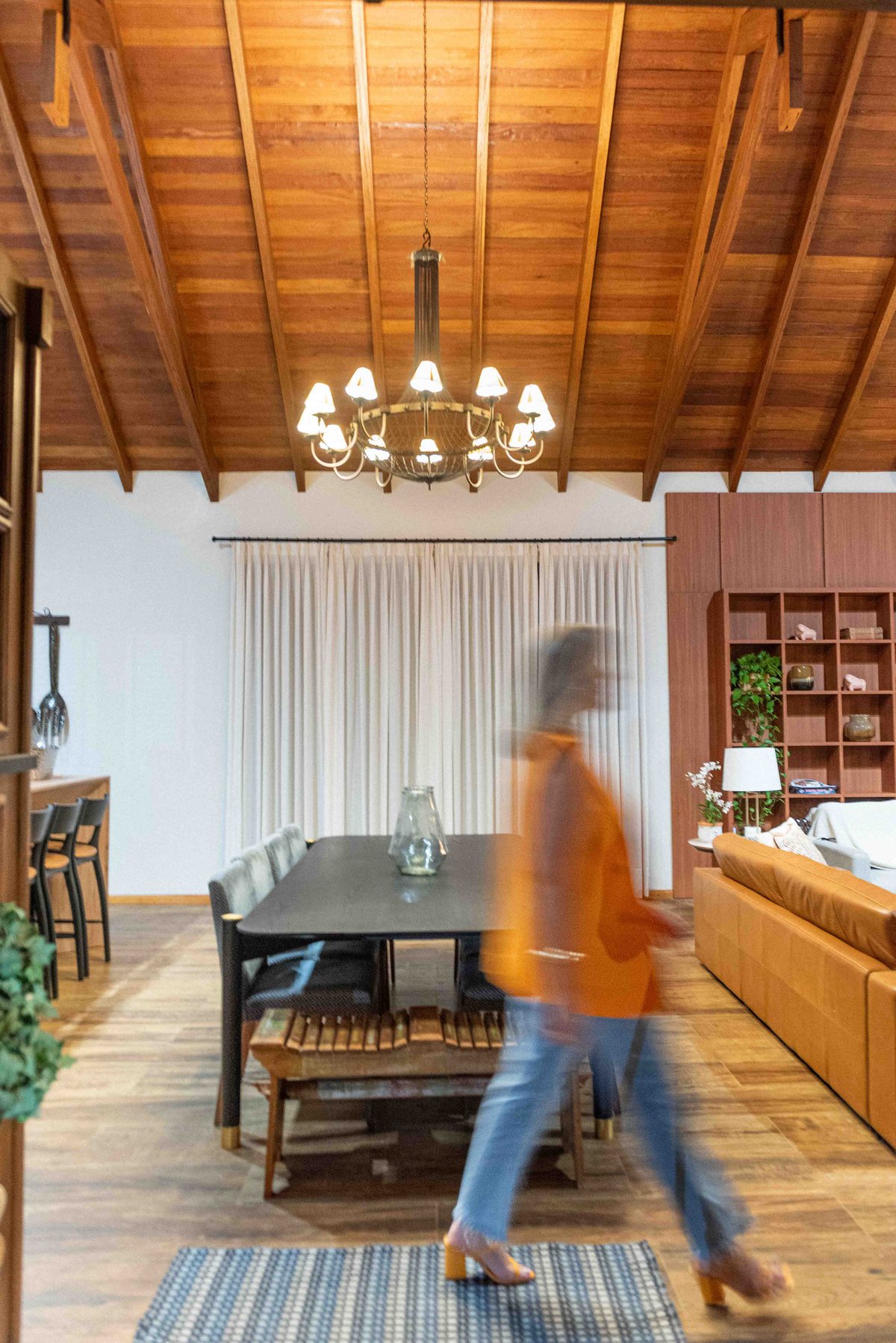 Internamente, o pé-direito elevado com estrutura aparente em madeira aquece visualmente o ambiente, enquanto a marcenaria sob medida e o mobiliário confortável completam a atmosfera de lar. A iluminação natural é valorizada por aberturas bem posicionadas e cortinas leves que emolduram a paisagem.