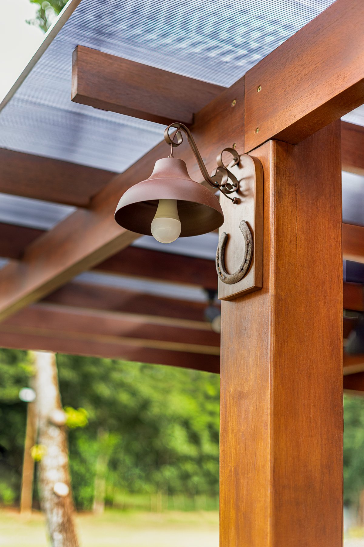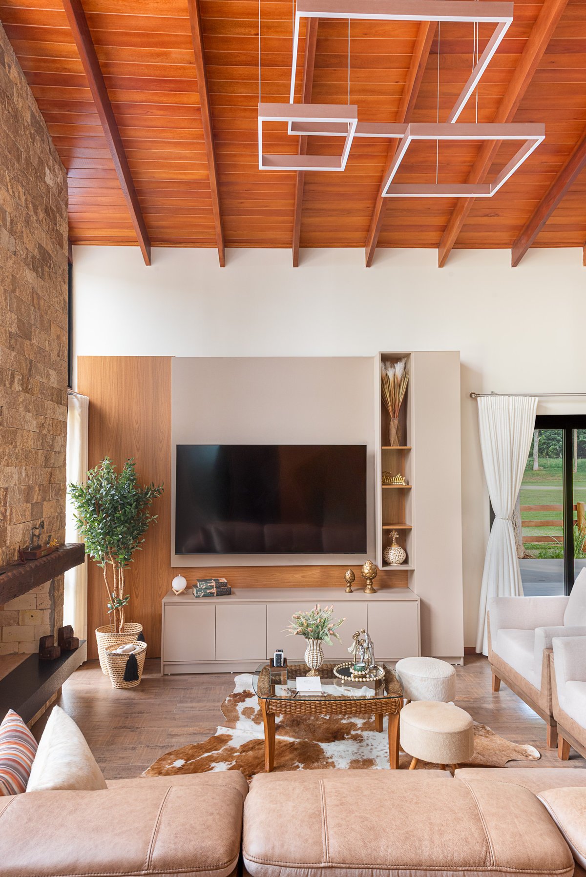 A alvenaria convencional foi utilizada apenas nos volumes estratégicos que abrigam os banheiros, lareira e churrasqueira — elementos que receberam acabamento em pedra natural, reforçando o vínculo com o entorno rural e adicionando textura e robustez ao conjunto.