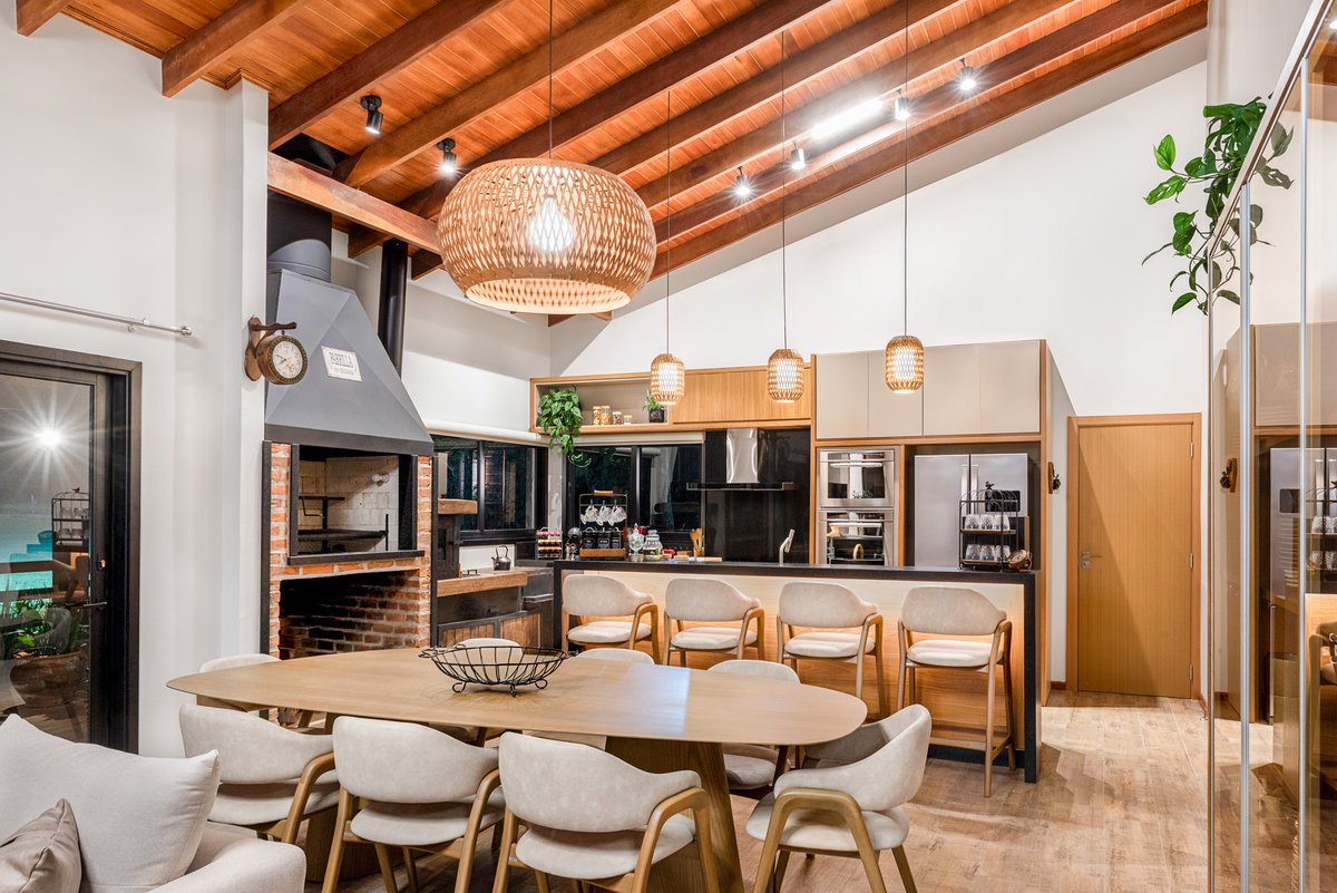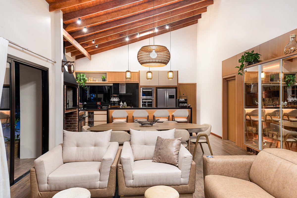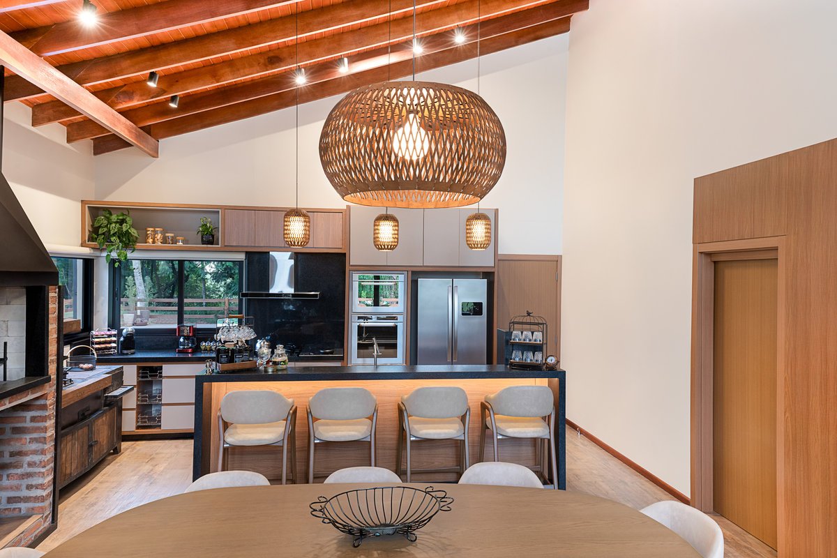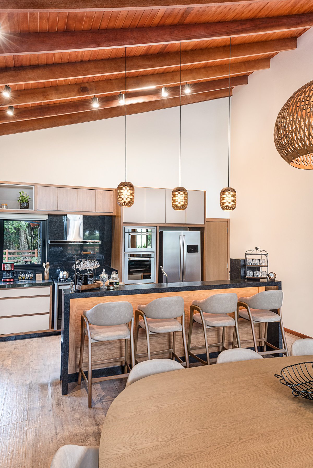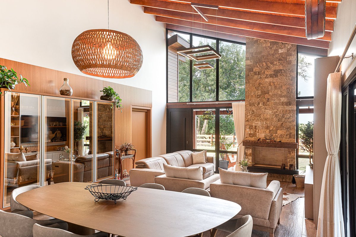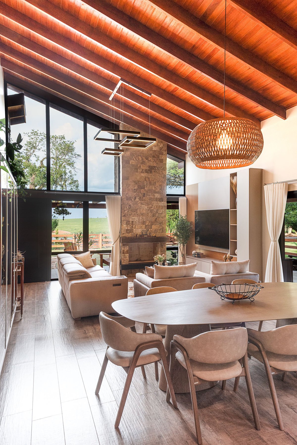 O projeto é composto por dois volumes bem definidos: o primeiro, com pé-direito elevado e estrutura de madeira aparente, abriga os ambientes sociais em planta livre. Grandes aberturas promovem integração com a paisagem e permitem ampla entrada de luz natural, conectando interior e exterior com fluidez.