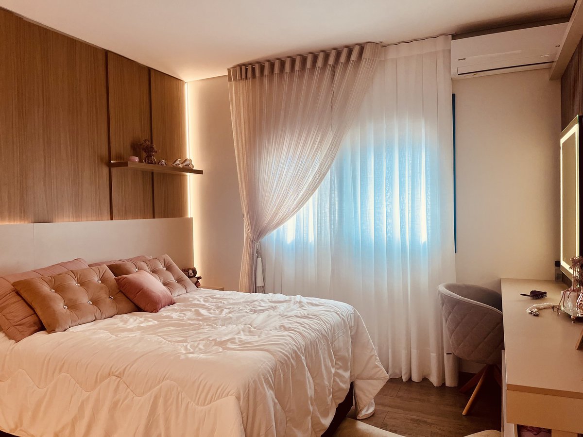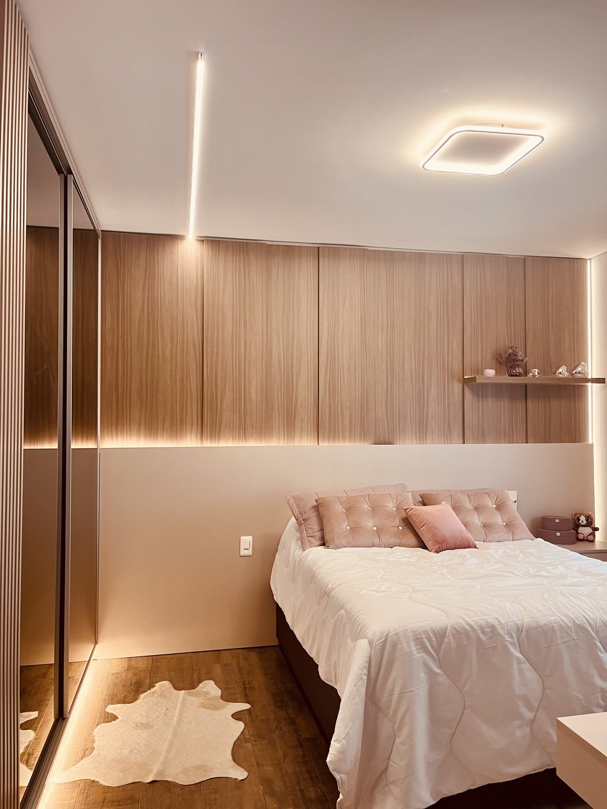 No segundo volume, dedicado à área íntima, estão três suítes com pé-direito mais baixo e forro em gesso, o que cria uma atmosfera acolhedora e serena para o descanso dos moradores.