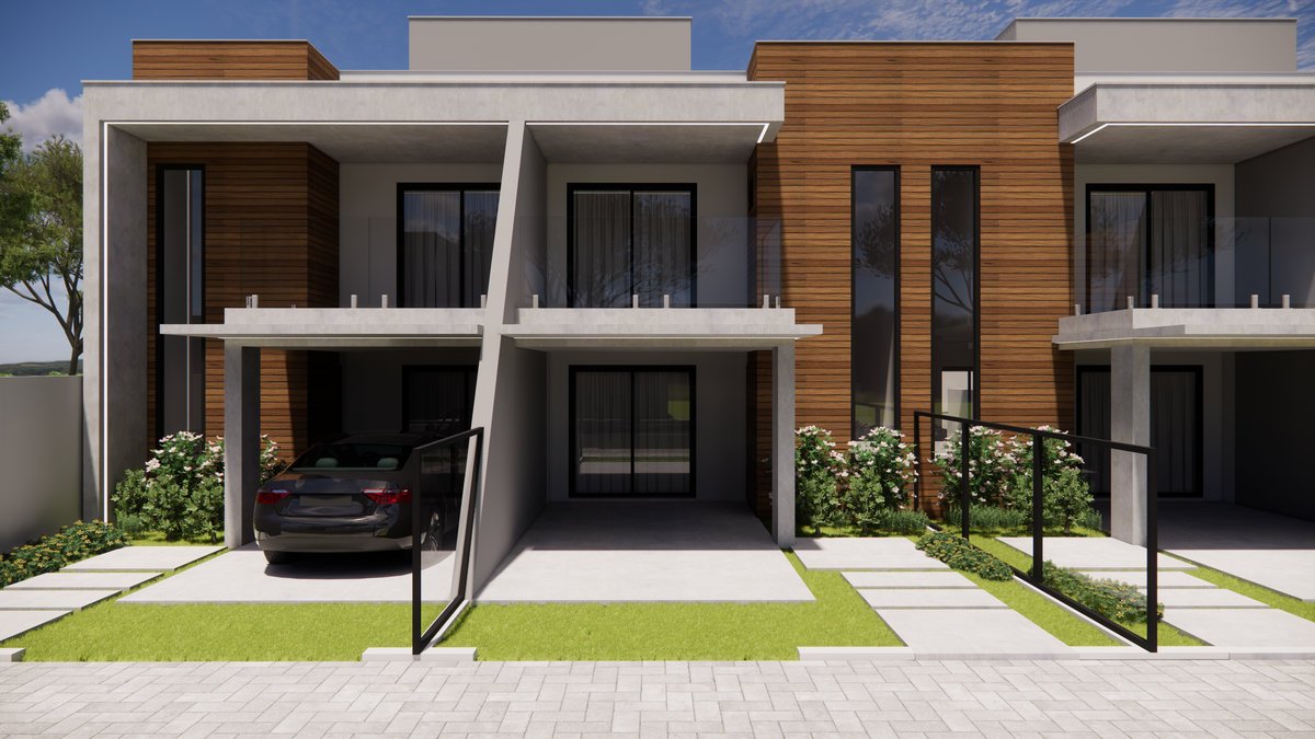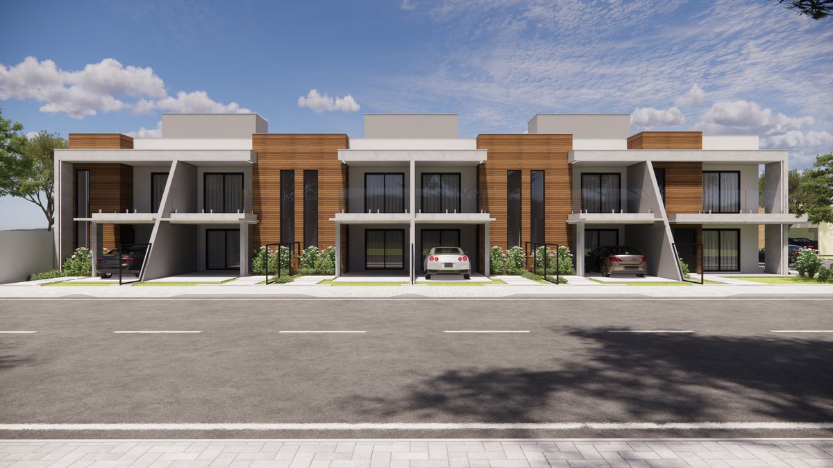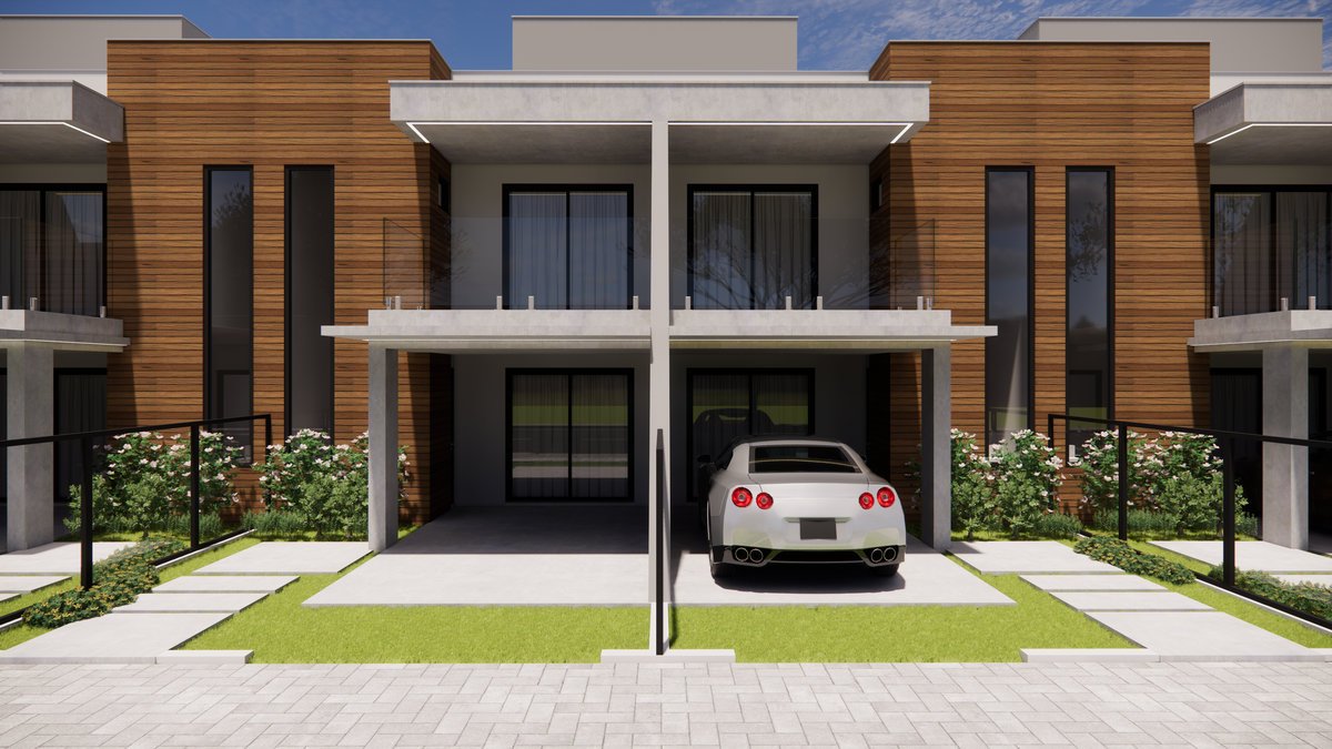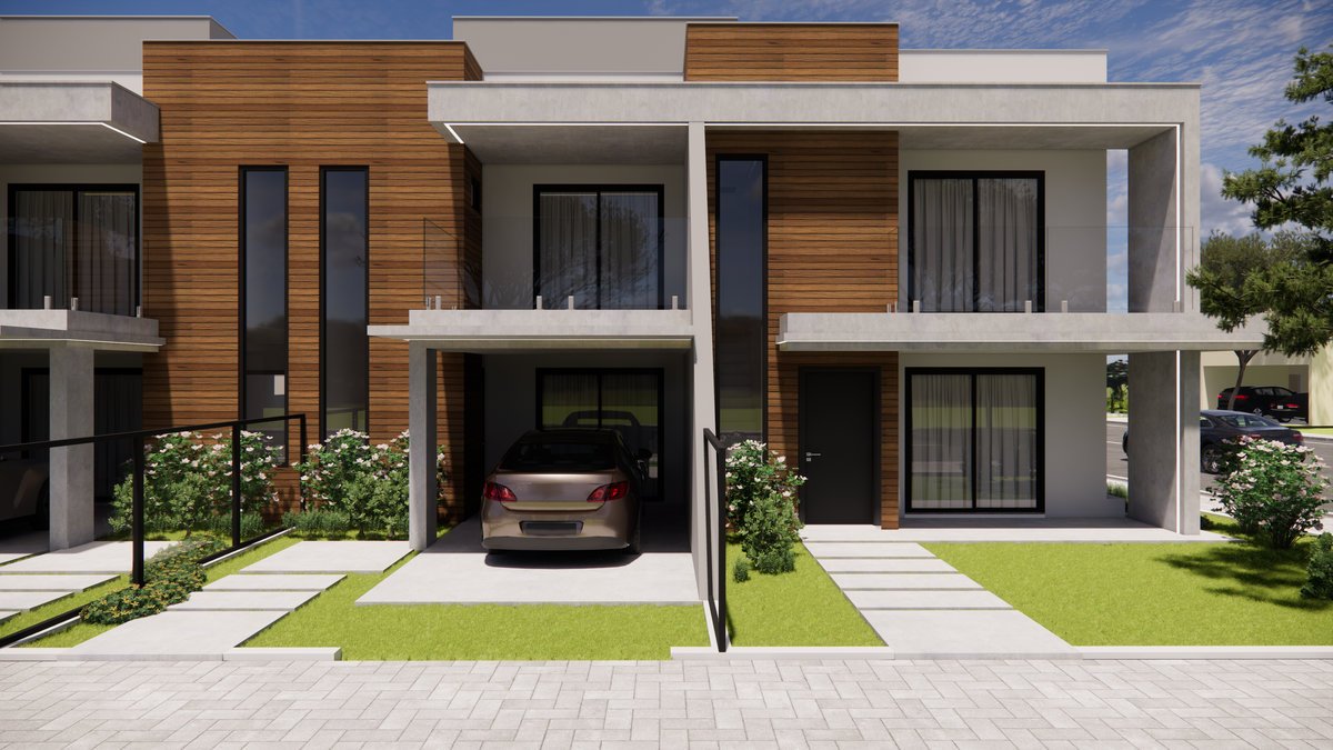 Cada unidade conta com garagem privativa, área social e de serviço no térreo, e área íntima no pavimento superior. As fachadas contemporâneas combinam revestimento amadeirado, concreto aparente e vidro, resultando em um conjunto harmônico e elegante. O Estar com vista para o pôr do sol completa a atmosfera acolhedora deste condomínio moderno.