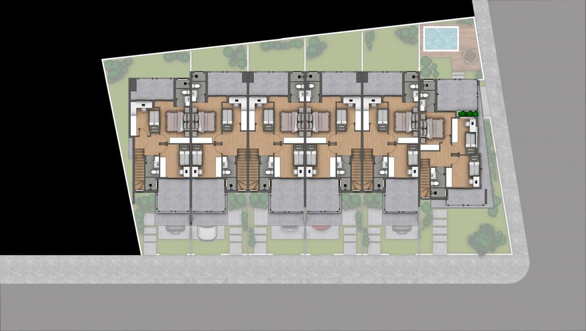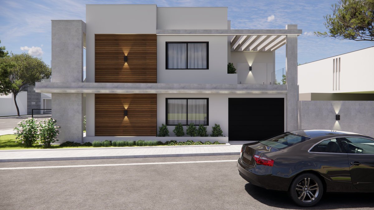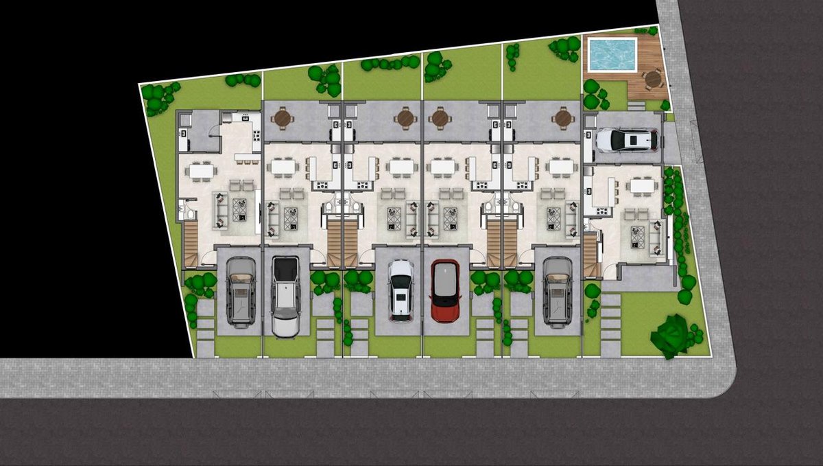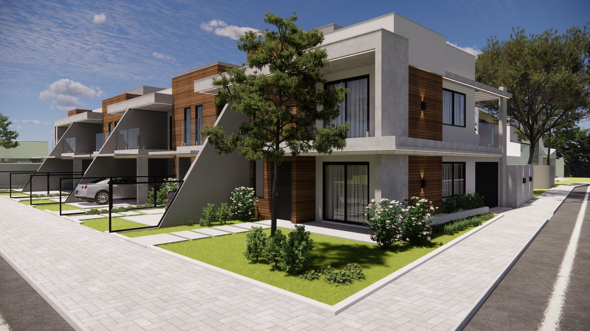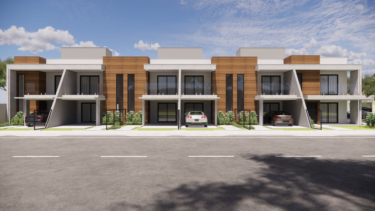 Cada unidade conta com garagem privativa, área social e de serviço no térreo, e área íntima no pavimento superior. As fachadas contemporâneas combinam revestimento amadeirado, concreto aparente e vidro, resultando em um conjunto harmônico e elegante. O Estar com vista para o pôr do sol completa a atmosfera acolhedora deste condomínio moderno.